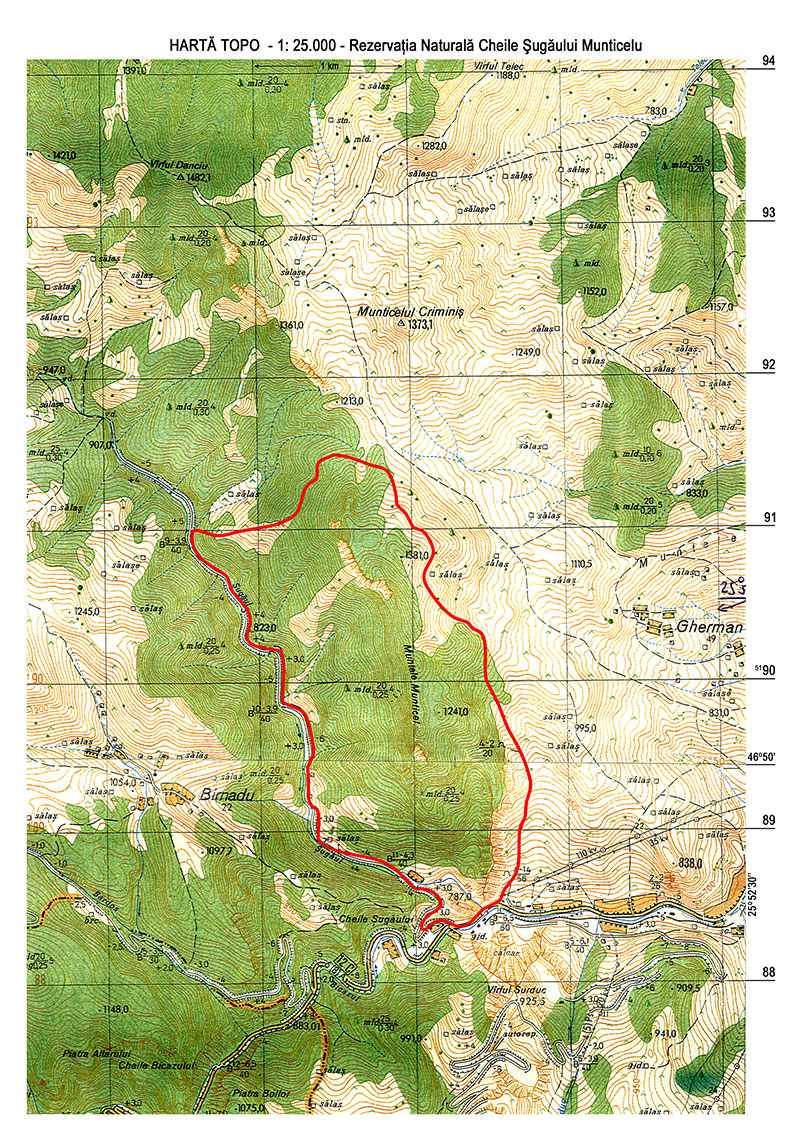 obârşia pârâului Tepeşeni – vf. Criminis (Nord). Munticelu face parte din