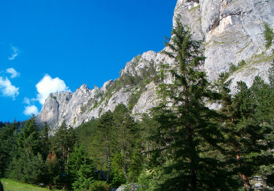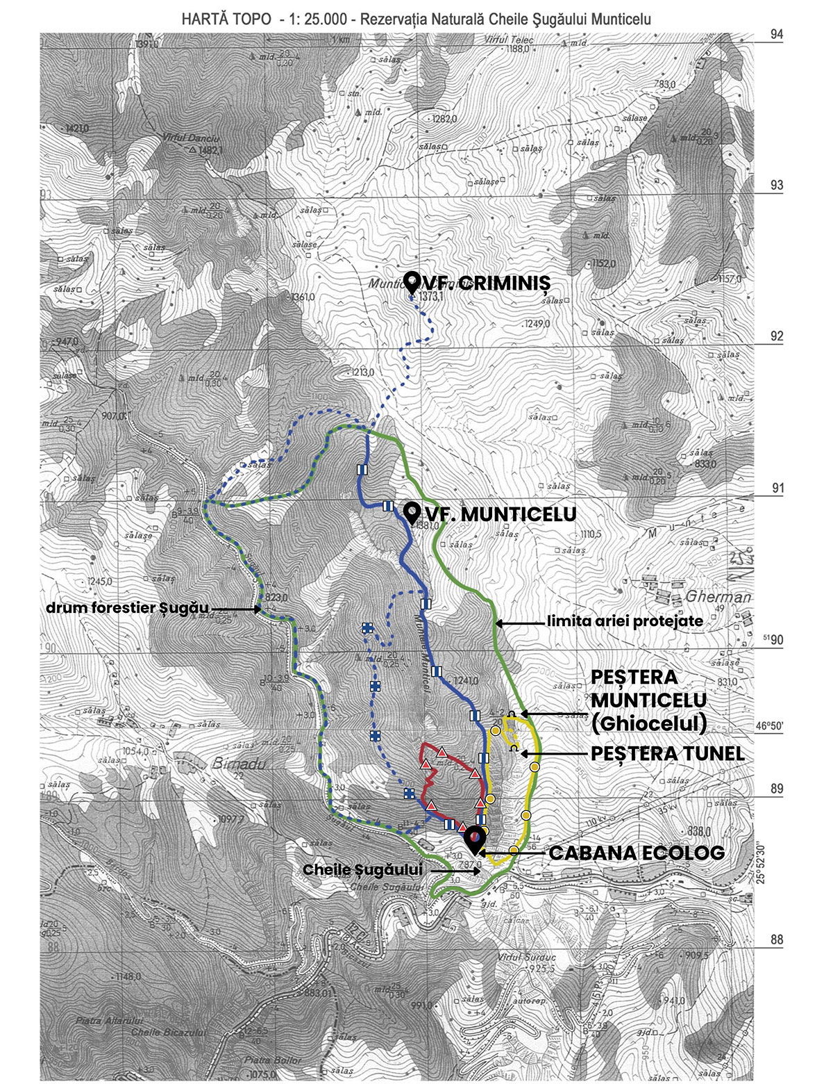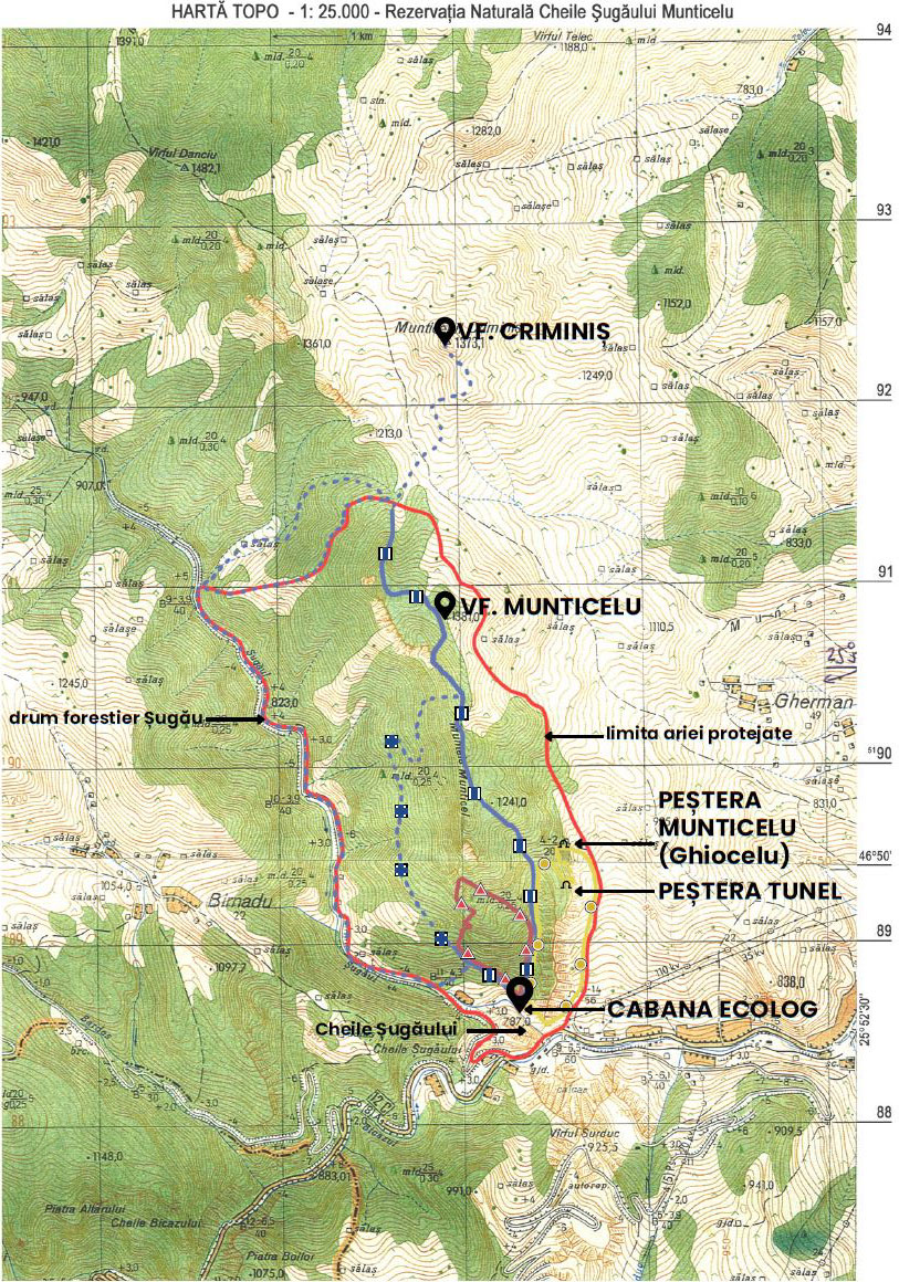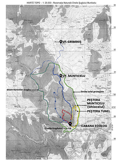 TRASEUL 1 : Cabana Ecolog –Jgheabul cu Luși – Peștera Tunel – Peștera Munticelu și retur: pe același traseu sau: pe culmea ȋnierbatǎ la est de Piatra Glodului, direct in DN 12c (marcaj sporadic)