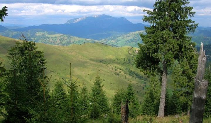 Ceahlǎul vǎzut de pe culmea Munticelu (marcaj bandǎ albastrǎ)