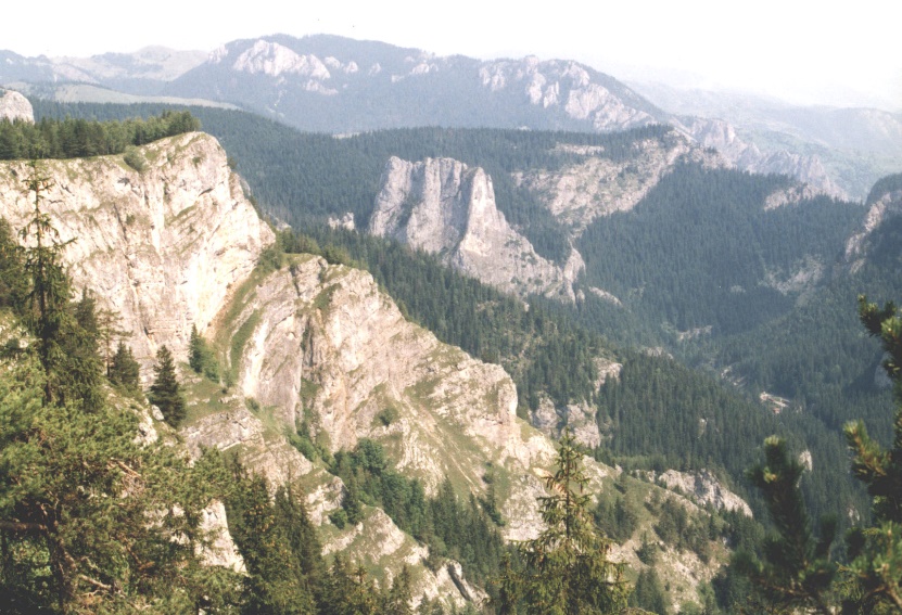 Cheile Bicazului - ȋn centru: Piatra Altarului; ȋn ultimul plan: Masivul Munticelu